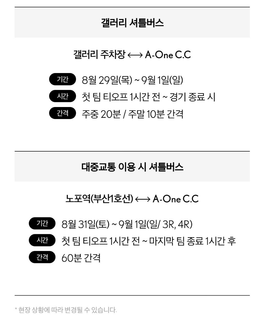대회 기간 동안 첫조 티오프 1시간 전부터 경기 종료시까지 주중엔 20분, 주말엔 10분 간격 운행합니다.