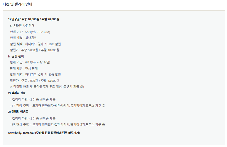 1. 온라인 사전 판매는 6/12일까지 하나 원큐 앱을 통해서 하나카드 결제 시 50% 할인 가능합니다.
