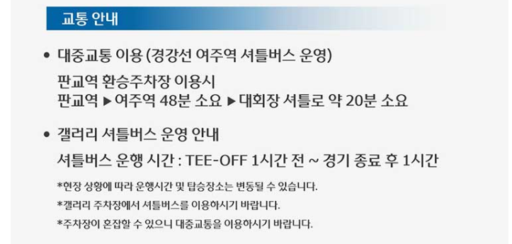 경강선 여주역 셔틀버스는 TEE-OFF 1시간 전부터 경기 종료 후 1시간까지 운행합니다.