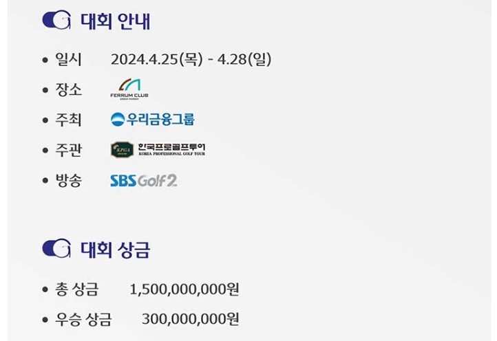 총상금 15억 원, 우승상금 3억 원에 달하는 2024 KPGA 우리금융 챔피언십 골프 대회를 경기도 여주에 위치한 페럼 CC에서 2024년 4월 25일(목)부터 28일(일)까지 개최됩니다.