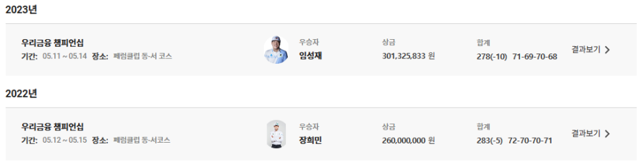 2022년 시작된 우리금융 챔피언십의 우승자는 장희민 프로, 작년은 미국 PGA에서 활약중인 임성재 프로 입니다.
