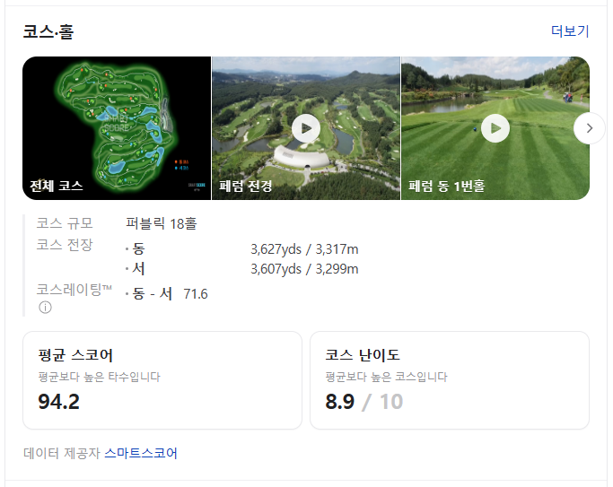 스마트스코어 기준 평균 스코어는 94.2타로 평균보다 높은 타수이고, 코스난이도는 8.9점으로 꽤 높은 편입니다.