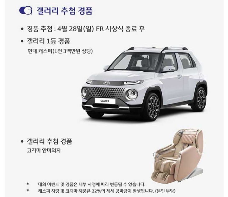 갤러리 추첨 경품은 마지막 라운드가 있는 4월 28일 FR 시상식 종료 후 추첨하며, 1등 경품은 1천 3백만원 상당의 현대 캐스퍼이며, 추첨 경품은 코지마 안마의자 입니다.