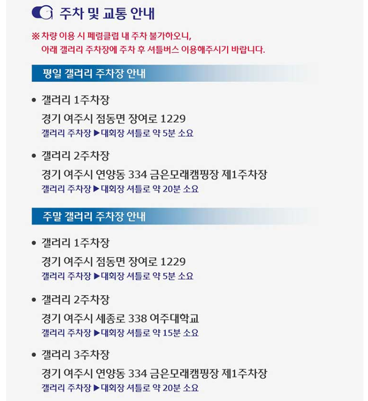 갤러리 1 주차장 : 경기 여주시 점동면 장여로 1229 (셔틀로 약5분 소요)