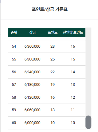 총 144명의 선수 중 60명의 선수가 상금을 받습니다. 우승자는 3억원, 최저 상금 600만원 입니다.