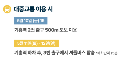 5월 11일 토요일 및 12일 일요일에는 기흥역 하차 후, 3번 출구에서 셔틀머스 탑승하면 되며, 15분 소요된다고 합니다.