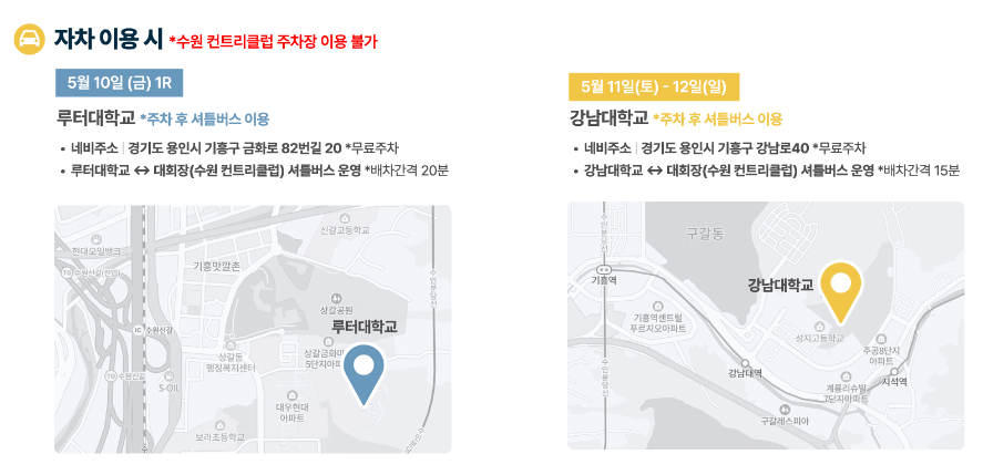 5월 11일 토요일 및 12일 일요일은 강남대학교 (경기도 용인시 기흥구 강남로 40) 이며, 주 차비용은 무료, 셔틀버스의 배차 간격은 15분입니다.