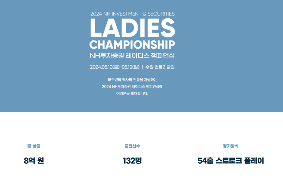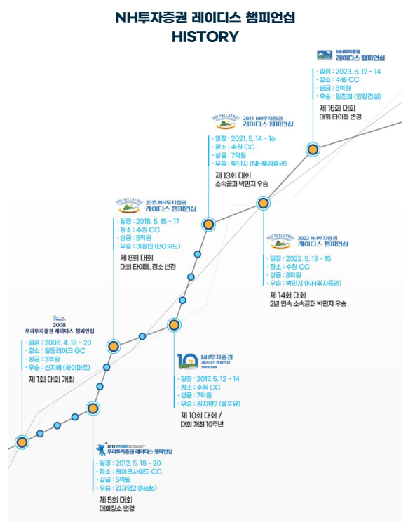 2008년 제1회 대회로 우리투자증권 레이디스 챔피언십으로 시작한 대회는 올해로 16회 대회로 작년에 바뀐 NH투자증권 레이디스 챔피언십이라는 이름으로 개최됩니다.