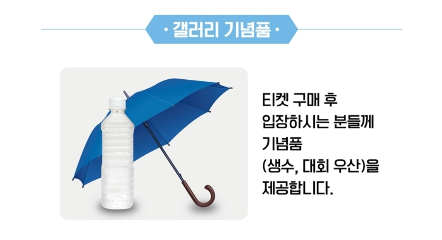 갤러리 기념품은 티켓 구매 후 입장하는 사람 대상으로 생수, 대회우산을 제공합니다.