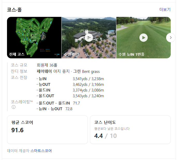 회원제 36홀로 구성되어 있으며, 스마트스코어 기준 평균 스코어는 91.6타, 코스난이도는 4.4점으로 평균보다 쉬운 곳이라고 합니다.