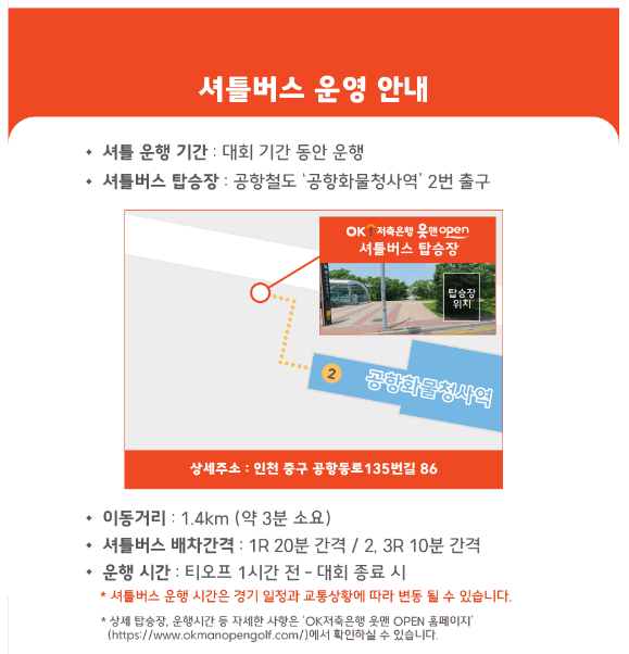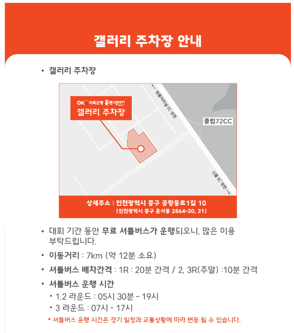 그 외에도 공항화물청사역에서 셔틀버스가 1R는 20분간격, 2, 3R는 10분 간격으로 티오프 한시간전부터 대회 종료시까지 운영됩니다.