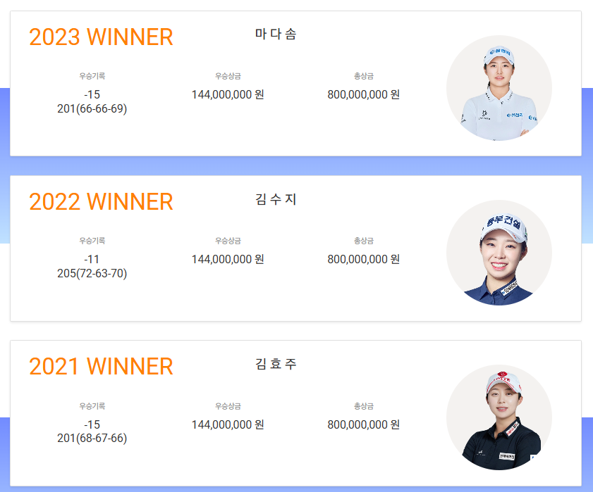 2021년엔 김효주 선수, 2022년은 김수지 선수가 우승자이며, 2023년 디펜딩 챔피언은 마다솜 선수 입니다.