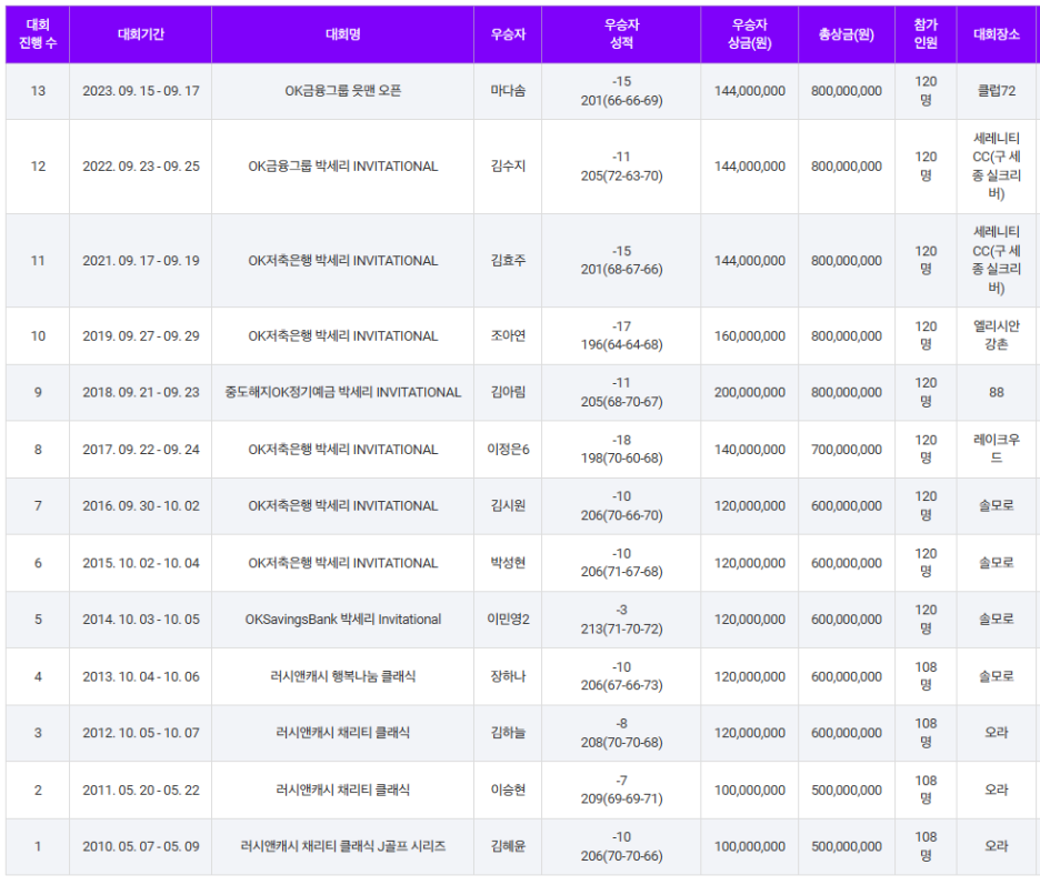 2010년 러시앤캐시 채리티 클래식 J골프 시리즈로 시작되어 OK저축은행 박세리 인비테이셔널 등 대회명 변동이 있던 대회입니다.