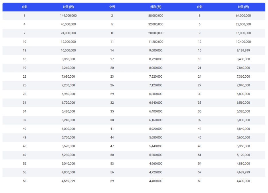 우승자는 1억 4천 4백만원, 최저 상금 440만원 입니다.