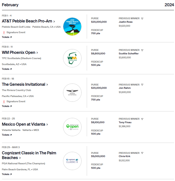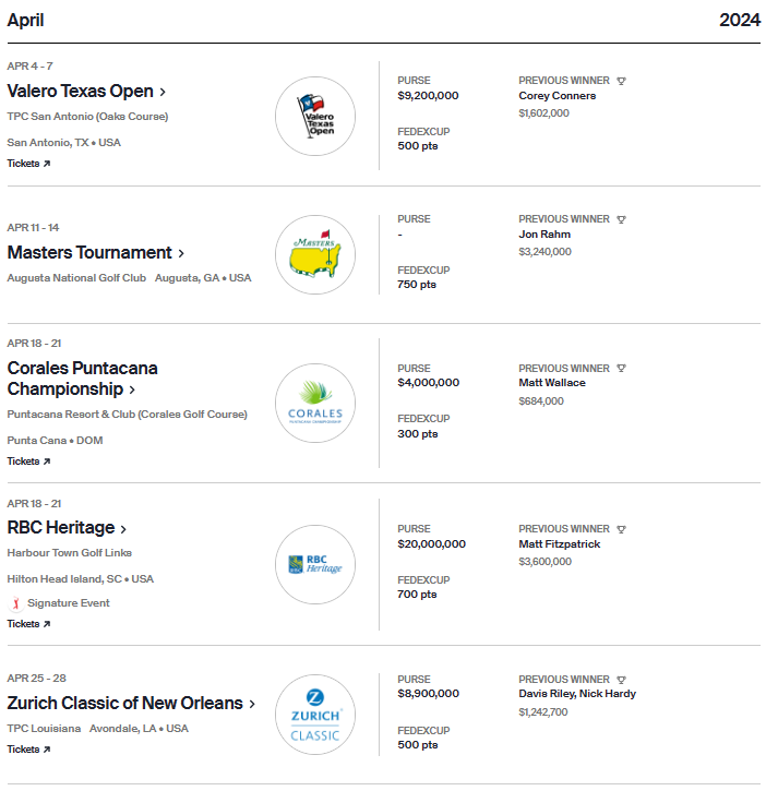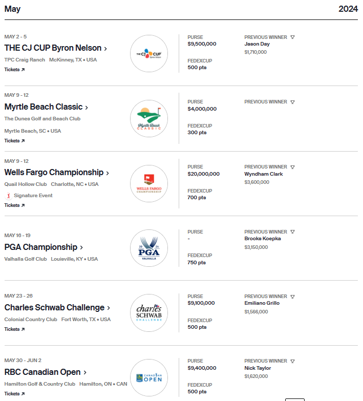 1. 2024년 PGA 대회 일정 (파란색은 Major 대회 일정)