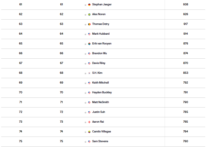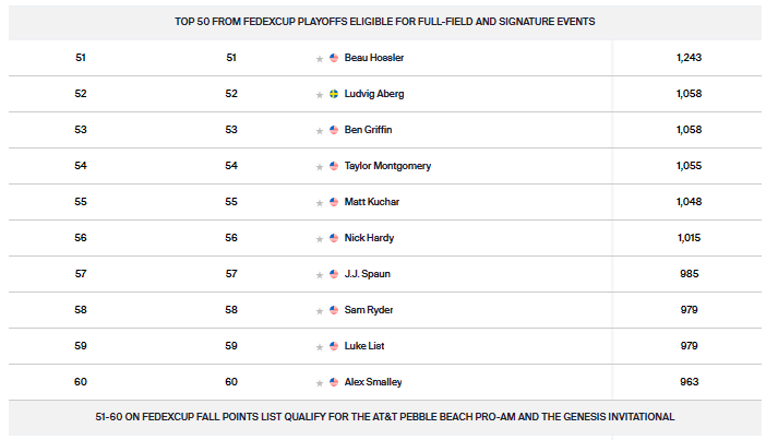 51위에서 60위 선수까지는 AT&T PEBBLE BEACH PRO-AM 및 THE GENESIS INVITATIONAL 참여권이 부여됩니다.