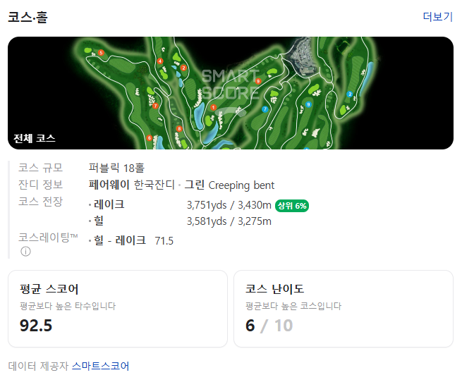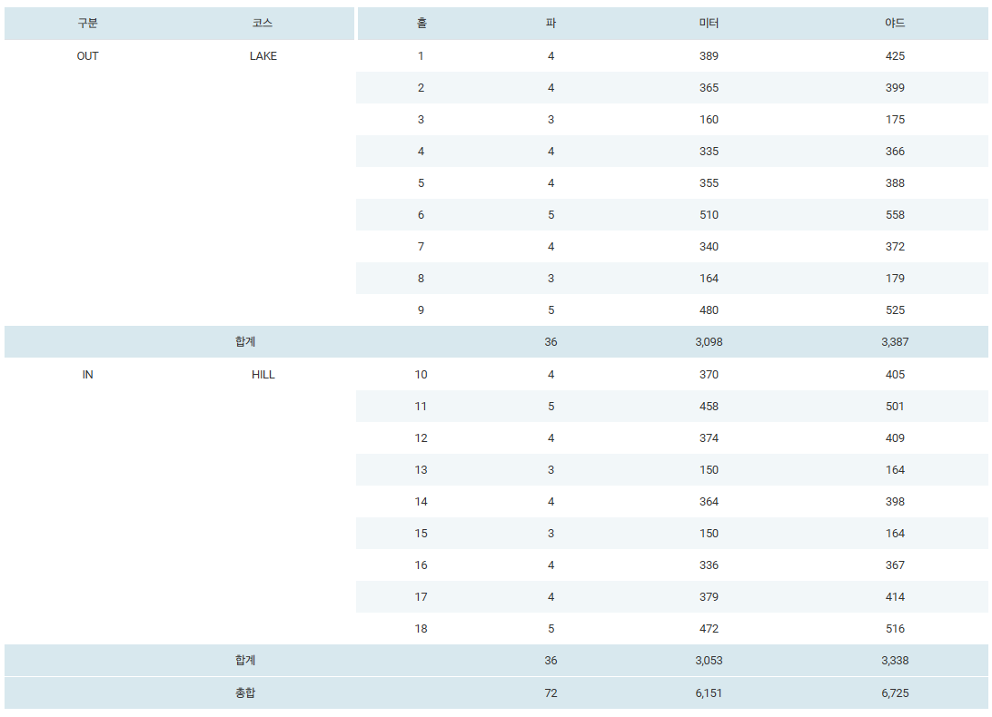 경기코스는 LAKE 코스와 HILL 코스인데, 총 전장은 6,151 미터, 6,725 야드 입니다.