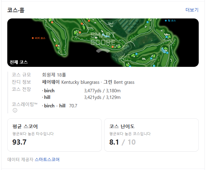 HILL 코스와 BIRCH 코스인데, 총 전장은 5,878 미터, 6,429 야드 입니다.