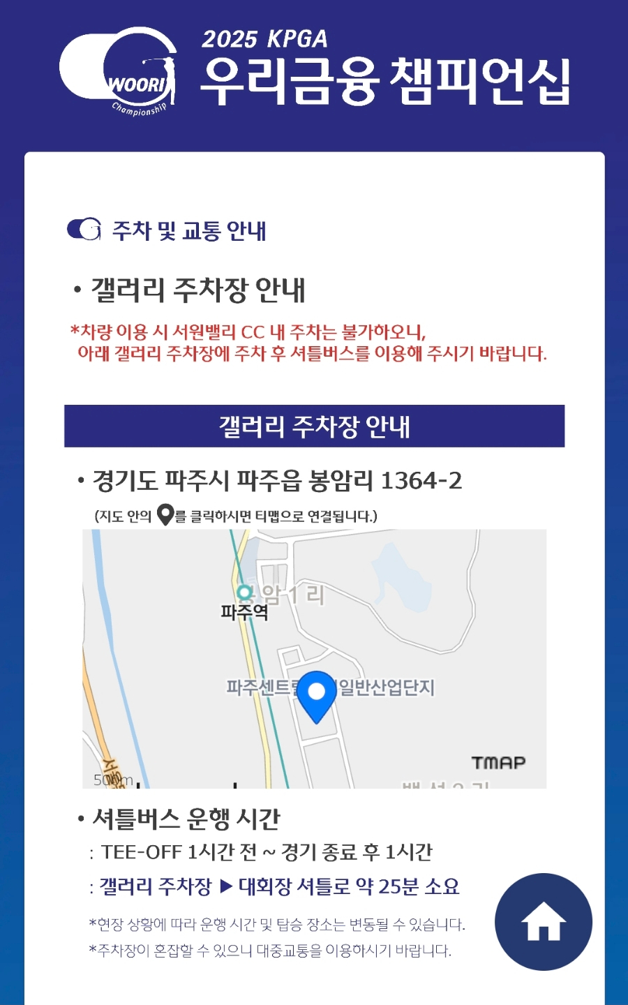 갤러리 주차장에서의 셔틀버스는 TEE-OFF 1시간 전부터 경기 종료 후 약 1시간 동안 운영되며, 이동 기간은 약 25분 소요됩니다.