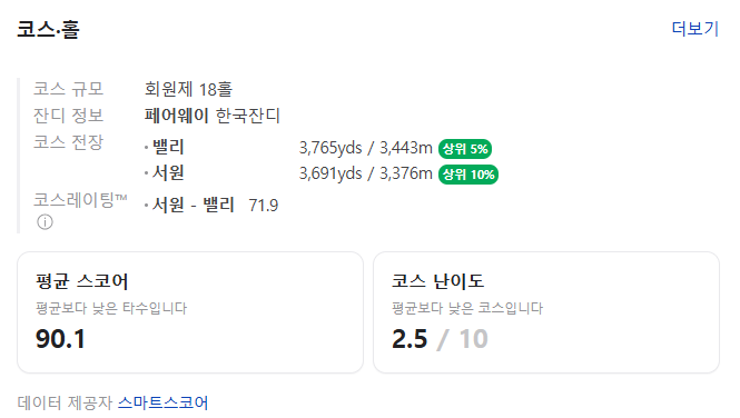 서원밸리CC는 스마트스코어 기준 평균스코어 90.1타로 평균보다 낮은 타수, 코스 난이도도 2.5점으로 낮은 편입니다.