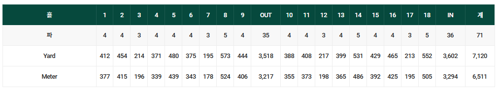 경기코스는 북서코스로 총 전장은 6,511 미터, 7,120 야드 입니다.