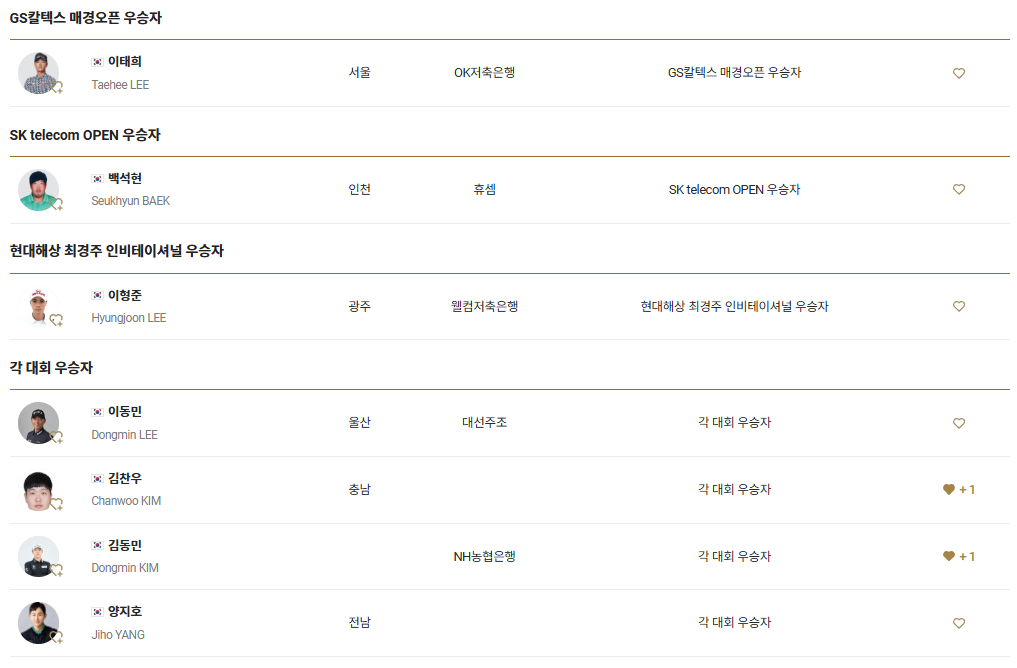 GS칼텍스 매경오픈 우승자 이태희, Sk telecom OPEN 우승자 백석현, 현대해상 최경주 인비테이셔널 우승자 이형준, 각 대회 우승자 이동민, 김찬우, 김동민, 양지오 선수 등 133명의 선수가 참가합니다.