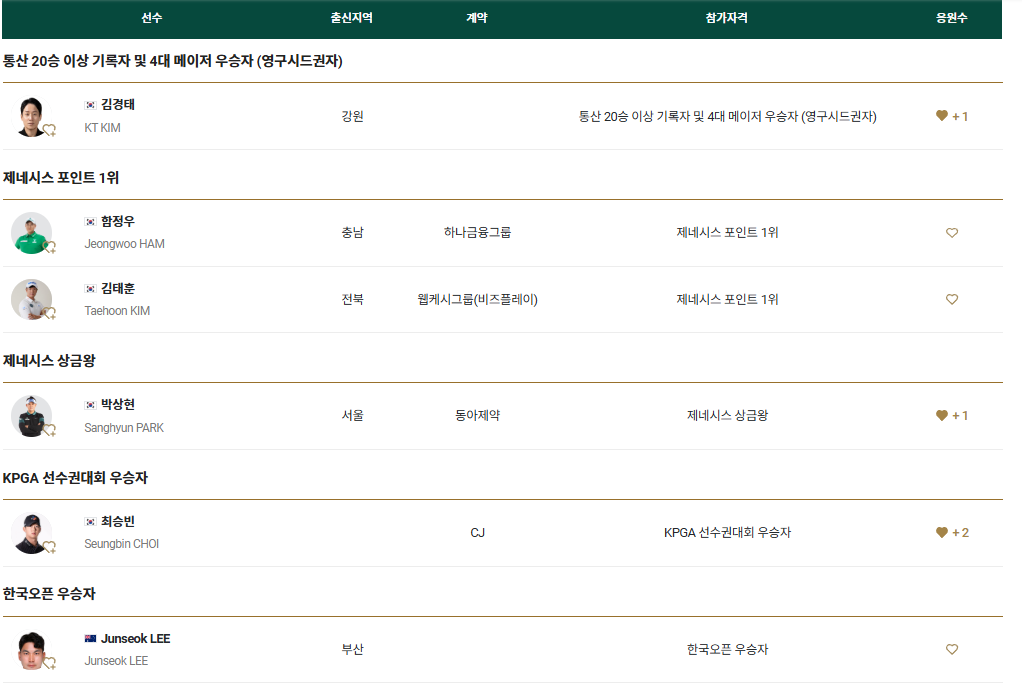 그 외에도 통산 20승 이상 영구시드권자인 김경태, 제네시스 포인트 1위 함정우, 김태훈, 제네시스 상금왕 박상현, KPGA 선수권대회 우승자 최승빈, 한국오픈 우승자 이준석,