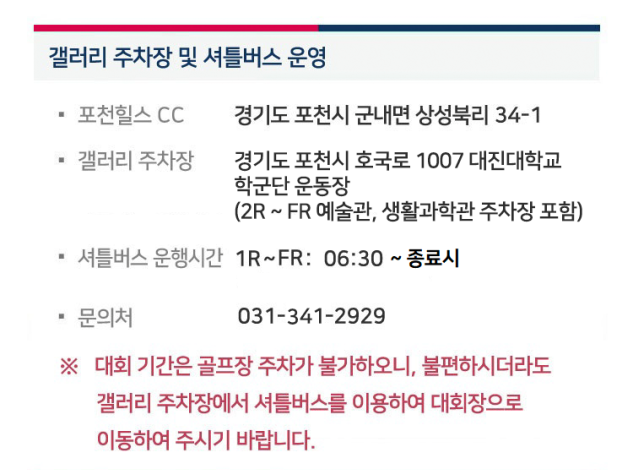 대회 기간 중에는 골프장 주차가 불가합니다. 갤러리 주차장을 이용 후 셔틀버스로 대회장으로 이동해야합니다.