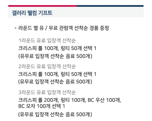 1,2라운드는 라운드별 유로관람객에 크리스피 롤 100개, 링티 50개 중 선택 1개 증정이며, 유무료 입장객 상관없이 선착순 음료 500개 증정 입니다.