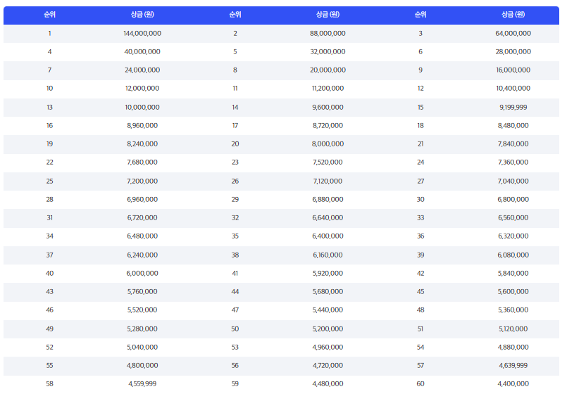 우승상금은 1.44억원이며, 60위 선수는 440만원의 상금을 받습니다.