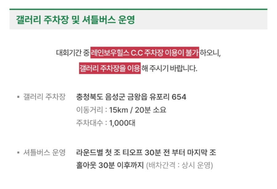 DB그룹 제39회 한국여자오픈 골프선수권대회 기간 동안에는 레인보우힐스 CC 내 주차가 불가 합니다.