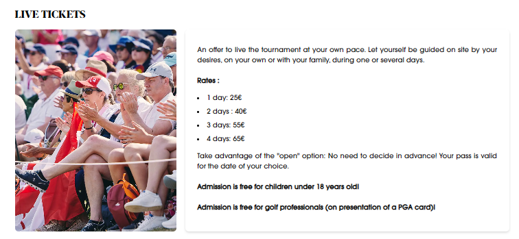 무료 티켓은 18세 이하 어린이, 청소년 및 PGA Card를 소유한 프로골프 선수 입니다.