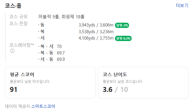 핀크스 GC는 스마트스코어 기준, 평균스코어 91타로 평균보다 낮은 타수이며, 코스 난이도도 3.6점으로 낮은 편입니다.