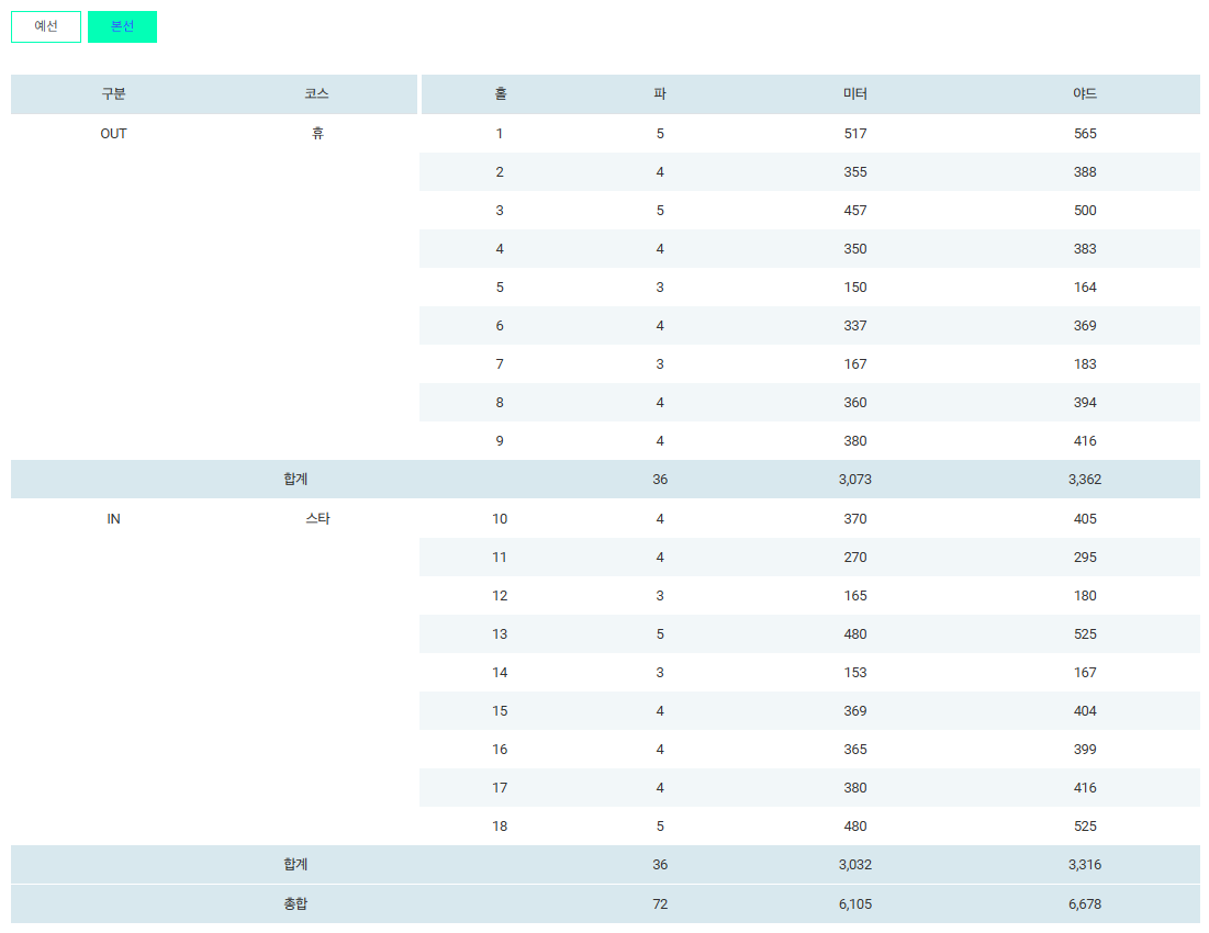 경기코스는 휴 코스와 스타 코스인데, 총 전장은 6,105 미터, 6,678 야드 입니다.