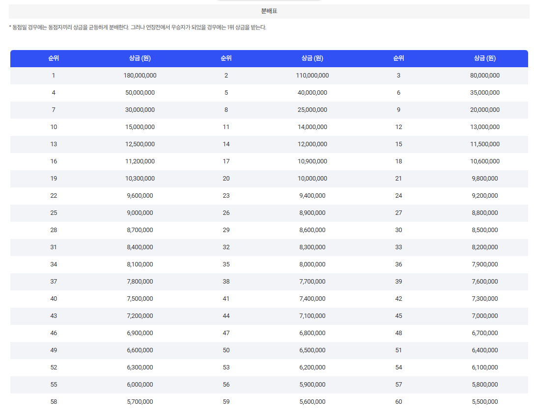 대회상금 : 총 상금 10억원 (우승상금 1.8억원)