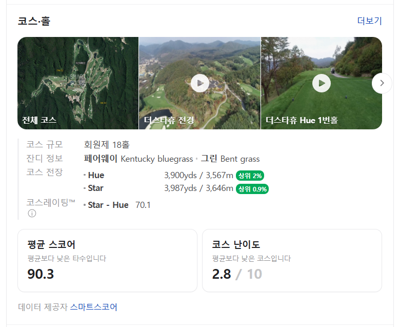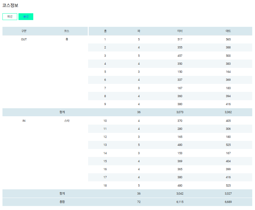 경기코스는 휴코스와 스타코스인데, 총 전장은 6,115미터, 6,689야드 입니다.